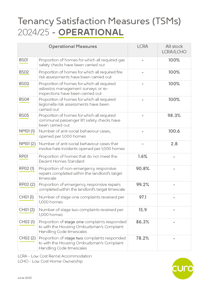 The TSMs have provided Curo with useful data and feedback from our customers on these core areas. In addition to tracking our performance every three months, we’re undertaking an in-depth analysis of what customers told us in 2024-25, so we can identify the most important areas for us to focus on. These conclusions will be developed into an action plan for improvement.