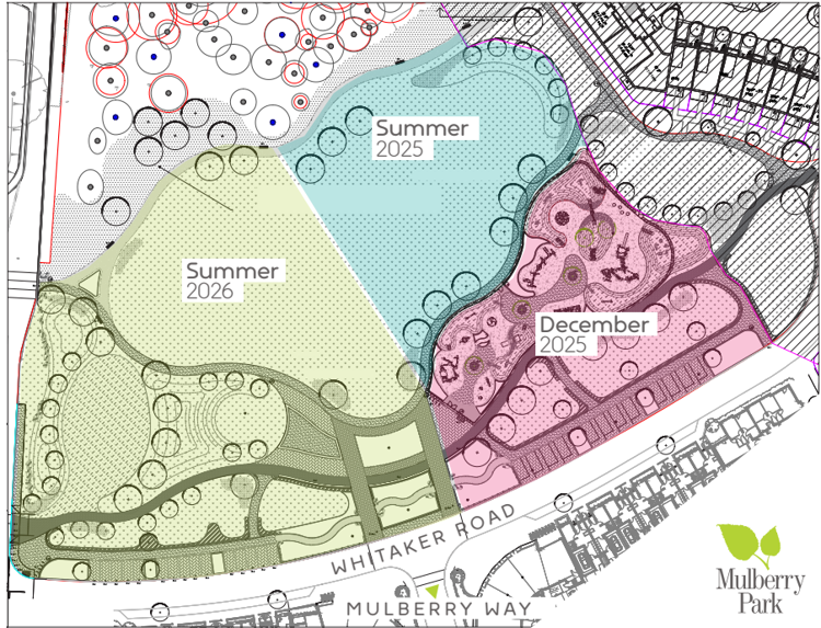 To provide a clear look at Mulberry Park's progression, we've designed a detailed map showing each phase and its associated timeline. Take a look here. This indicates when the park will be completed in full, but if you'd like to see the phases of the park's delivery, look at the link above.