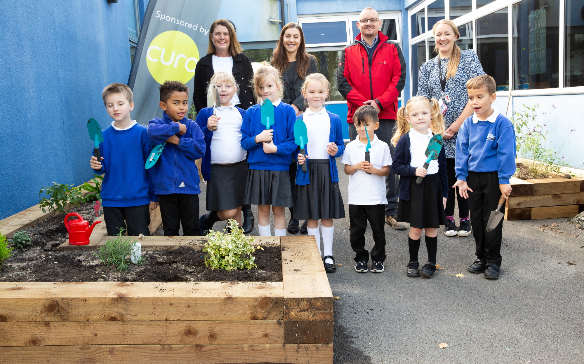 Image above: Curo Sales Advisor, Ruby Webber and Jehu Project Manager, Tomasz Magiera helping Year 1 and Year 2 pupils to plant their new sensory garden at Oasis Academy Bank Leaze.