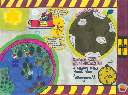 This fantastically detailed picture showing Santa flying around the world delivered lots of humour and individuality. It secured the runner-up prize for Mia in this category for older children. Our overall winner, Oskar, took was our 10-16 winner.