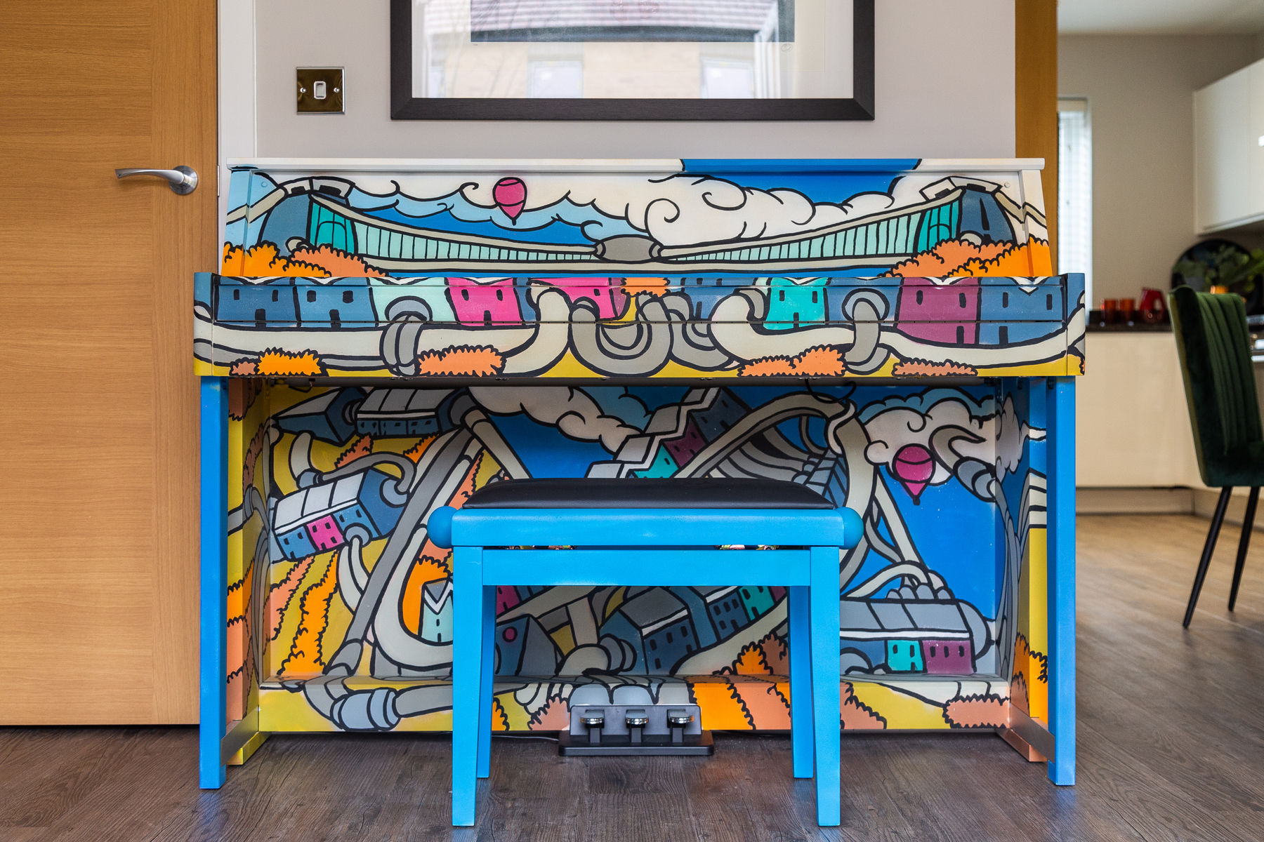 Andy also spray-painted a piano for the show home’s living room – the design combines the industrial heritage of the area with iconic Bristol symbols such as the Suspension Bridge, the Hot Air Balloon Festival and Clifton’s multicoloured houses.