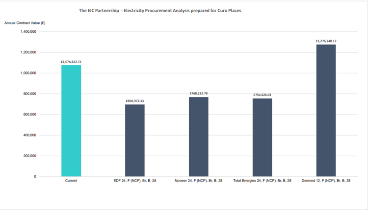 The best deal we could find for gas was through Total Energies. It is 255% higher than our previous deal. We locked into this deal for the next four years, to give us stability amid continued uncertainty in the energy market due to the war in Ukraine. The graph below shows the deals available to us when we renewed and how these compare with our previous deal.